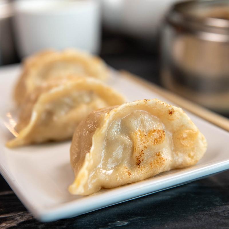 These dumplings are filled with ground pork, shrimp, garlic, and spinach, served with a side of soy sauce.